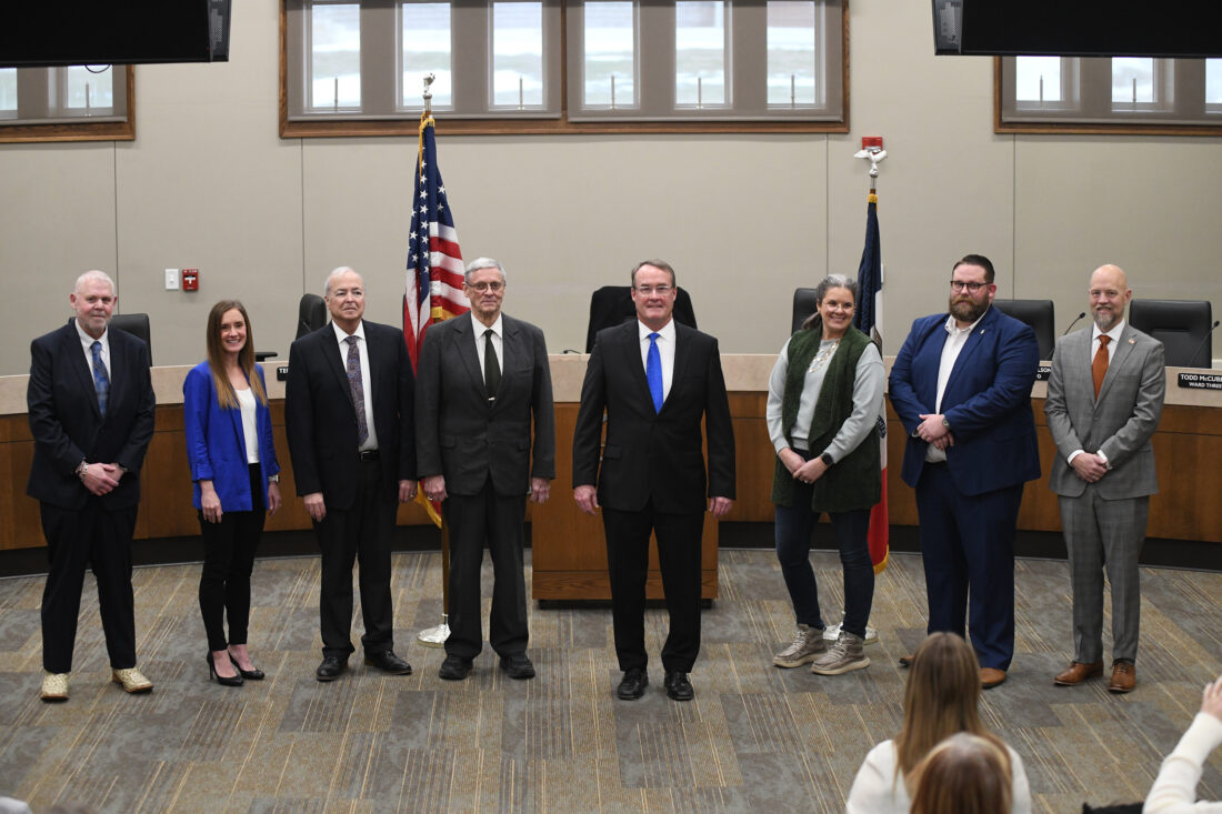 City Council members and new Mayor Dave Flattery stand in the City Council chambers after being sworn in. From left are Scott Davis, Jennifer Crimmins, Terry Moehnke, Kim Alstott, Flattery, Megan Secor, Cameron Nelson and Todd McCubbin.