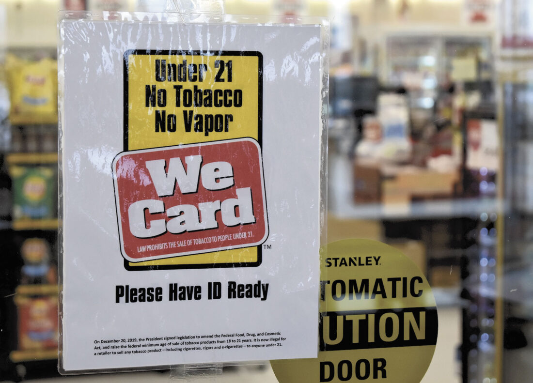 A sign at Fort Dodge’s Hy-Vee in March 2020 reflects the legal age to purchase tobacco and vaping products.