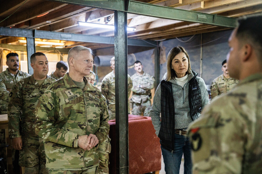Maj. Gen. Stephen Osborn, the adjutant general of Iowa, left, and Gov. Kim Reynolds speak with Iowa Army National Guard soldiers during a trip to the Middle East. About 1,800 Iowa troops are currently deployed there.