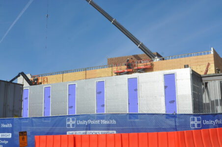 When approaching the main entrance of UnityPoint Health — Trinity Regional Medical Center it is impossible to miss the fencing, the orange barricades, and the boom of a huge crane reaching into the sky.