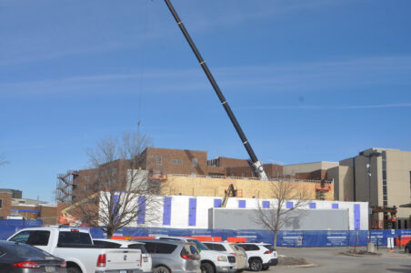 The boom of a huge crane towers over the construction of a new surgical center at UnityPoint Health — Trinity Regional Medical Center.
