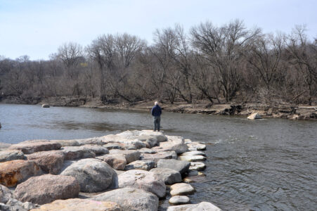 A man enjoys the view of the Des Moines River in April 2025 from a new fishing jetty behind the Matt Cosgrove River’s Edge Discovery Center in Fort Dodge.