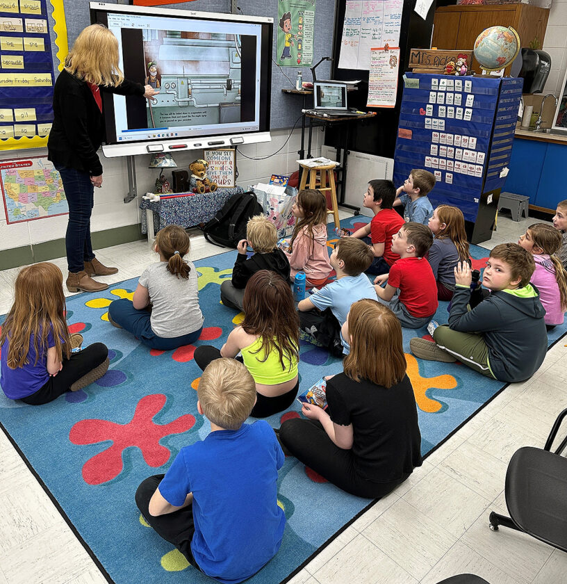 Students in Jill Carlson’s first-grade class at Manson Northwest Webster Elementary School in Barnum listen to the story “Right This Very Minute” about how farmers work to supply the foods they eat each day.