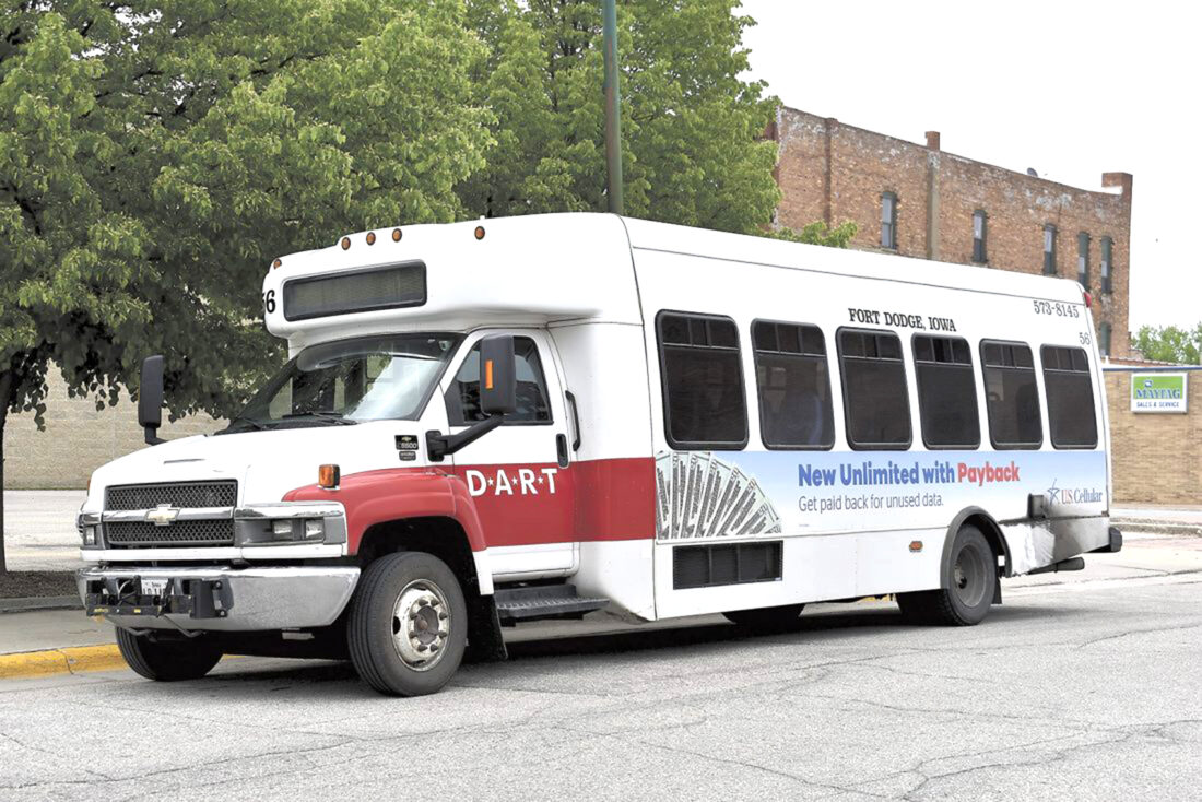 A Dodger Area Rapid Transit bus is parked along South Sixth Street in downtown Fort Dodge. The MIDAS director requested an increase in funding for the upcoming fiscal year.