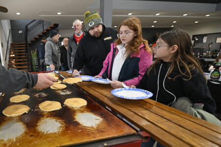 From left, Nicholas Kozal; Audrie Weiss, 10; and Charlie Weiss, 12, all of Rockwell City, grab a bite to eat at the pancake breakfast during TWINterfest Saturday at Twin Lakes. Proceeds from the breakfast went to the Manson and Rockwell City fire departments.