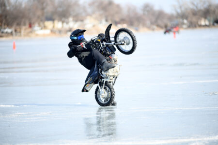 Kane Becker, 12, of Manson, pops a wheelie during TWINterfest on Saturday at Twin Lakes.