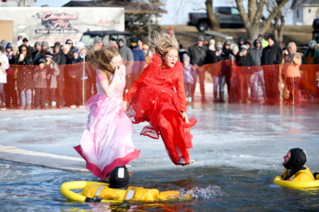 Kira Sharp, left, of Cedar Rapids, and Malori Mikkola, of Cedar Rapids, leap into Twin Lakes for the Polar Plunge on Saturday during TWINterfest.