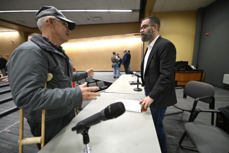 Al Hayek, of Fort Dodge, discusses land rights with state Sen. Jesse Greene, R-Boone, during the Eggs and Issues forum Saturday morning at Iowa Central Community College in Fort Dodge.