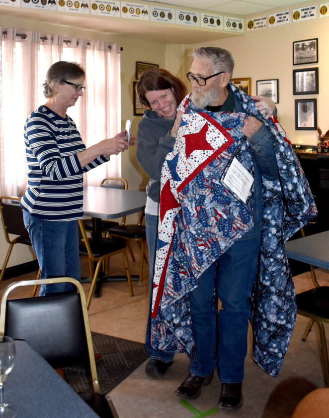 Luann Jackson, left and Jenny Manning of the Women’s Auxiliary surprised Ron Phelps with a Freedom Quilt.