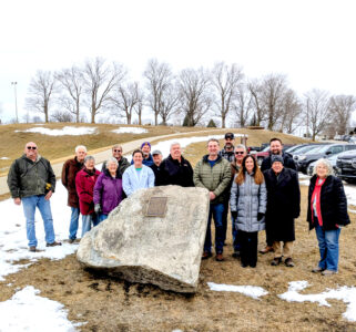 It was a sobering day when family and key partners gathered at Hospital Hill to commemorate the anniversary of a fatal Life Flight crash, which occurred 46 years ago on March 3. Pictured in back from left are Ed Griffin, Jim Adams, Darrell Kleckner, Gregg Olson, Bryan Gilbert, Brandon Bahrenfuss, Joel Peterson and Zack Chizek. In front from left are Sue Adams, Amy Kleckner, Brianne Lesher, Gerald Peterson, Kent Bailey, Lori Foster, Doug Bailey and Darlene Dingman. Family members of Maureen Griffin who were able to attend the ceremony included her brother Ed Griffin, Jim and Sue Adams, Darrell and Amy Kleckner, Brianne Lesher and Bryan Gilbert.