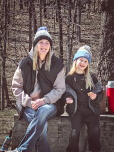 Renee and Violet Bertram sit by the boiling maple syrup while enjoying a s’more Saturday during the “Spring into Spring” event hosted by Webster County Conservation at Camp WaNoKi.