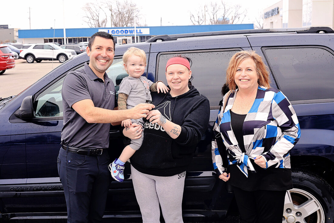 Pictured from left are Matt Johnson, of Fort Dodge Ford Lincoln Toyota, Skyler Pinkerton holding her son and Tricia Winninger of United Way of Greater Fort Dodge standing by a Jeep Grand Cherokee that was donated to the United Way’s Wheels to Work program.