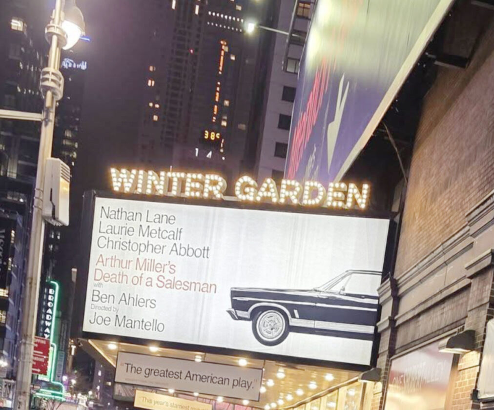 The marquee outside the Winter Garden Theatre on Broadway for “Death of a Salesman,” co-starring 2015 Fort Dodge Senior High graduate Ben Ahlers as Happy Loman.