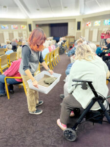 Nikki Dunbar shows a tortoise from Blank Park Zoo to Friendship Haven residents on Wednesday in Fort Dodge.