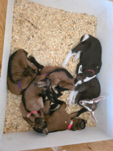Oberhasli kids (left) and Toggenburg kids (right) share a cozy space.