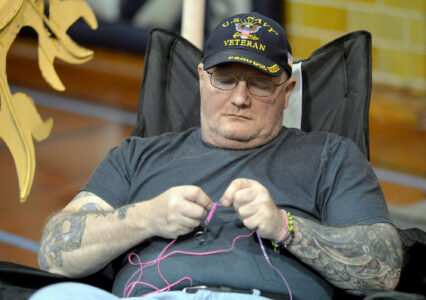 Daniel Currier, of Churdan, works on making a keychain Saturday at the Dayton Vendor Expo in the Dayton Community Center. Currier and his wife BJ were at the show as C&C Crafts.