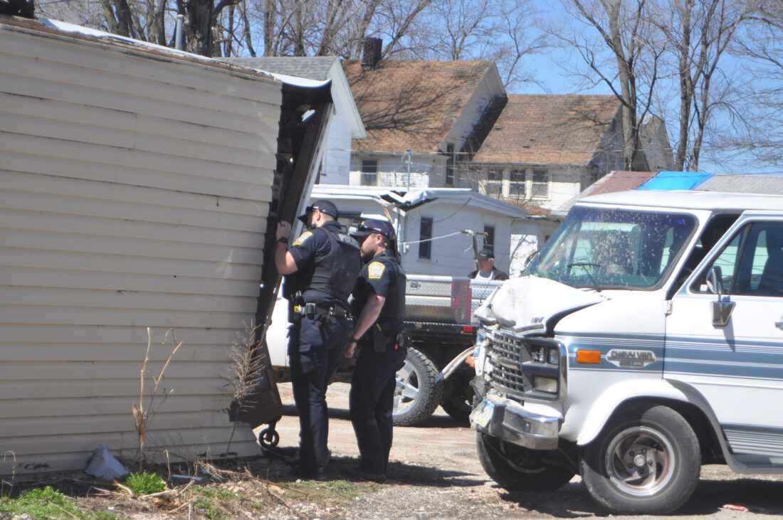 A pair of Fort Dodge police officers examine the damage after a Chevrolet van hit a house at 2210 13th Avenue S. Friday afternoon.