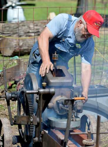 HOMER — Don Lamb, vice-president of the West Central Region Cockshutt & Co-op Club, had a big smile on his face Saturday afternoon after firing up his 1940s vintage David Bradley chainsaw at the club’s annual Threshing Bee in Homer.