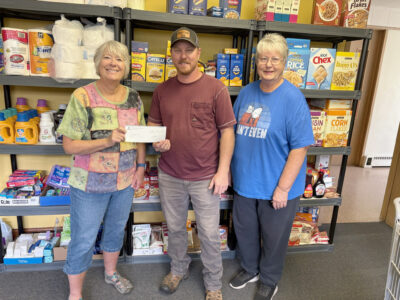 - Webster County Farm Bureau accepted freewill donations for the area food pantries at the annual Sweetcorn Feed held during the Webster County Fair. A portion of the proceeds were donated to the Emanuel Lutheran Food Pantry, Dayton. WCFB Board Vice President Gabe Heun presents a $1,250 donation to Barb Peterson, left, and Doreen Runyon.