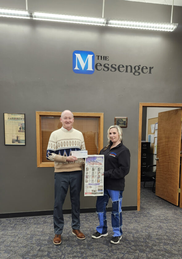 Messenger Publisher Grant Gibbons presents Sara Murphy, president of The Brushy Creek Area Honor Flight board, with a check from proceeds from the Salute To Veterans edition published in The Messenger in conjunction with Veterans Day. All donations made for veterans photos to be published were given to support the Brushy Creek Area Honor Flights.