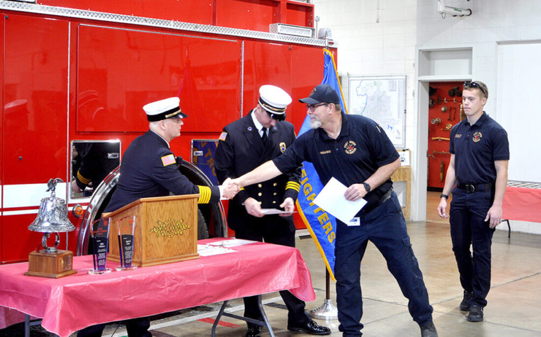 Fire Chief Steve Hergenreter congratulates Paramedic Brian Egemo after he received a Lifesaving Award last year for his role in reviving a 4-year-old boy who drowned in a swimming pool. Firefighter/Paramedic Kasey Porter, another member of the team that revived the boy, stands at right while Assistant Fire Chief Matt Price readies his award certificate.