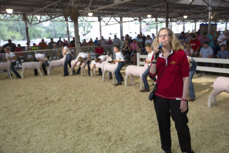 Wendy Wintersteen addresses the crowd during a sheep judging event at the 2018 Iowa State Fair.