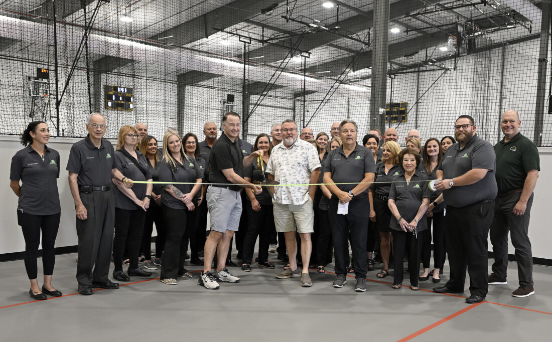A group prepares to snip the ceremonial ribbon to formally open the Pavilion Sports Complex at Corridor Plaza on Oct. 1, 2025.