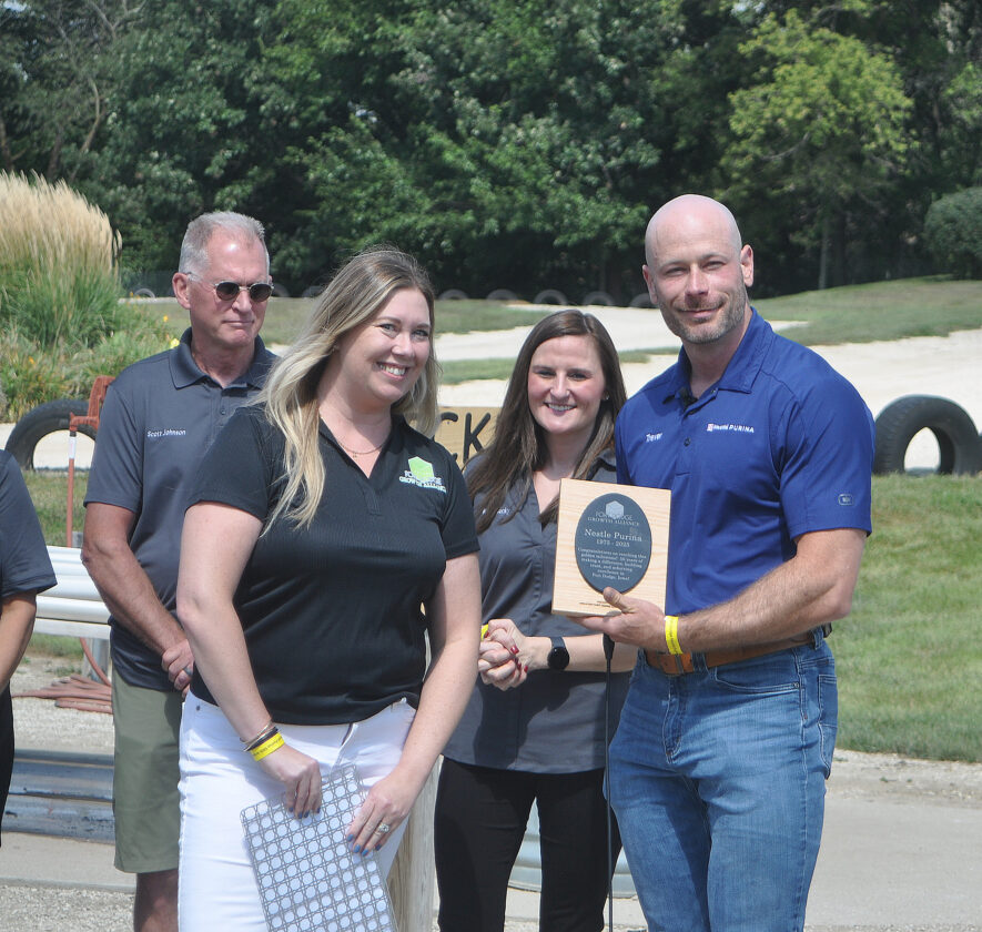 Trever Morgan, right, the factory manager for Nestle Purina PetCare in Fort Dodge, holds a plaque commemorating the 50th anniversary of the plant. The plaque was presented by Astra Ferris, left, the chief executive officer of the Greater Fort Dodge Growth Alliance. Two members of the Growth Alliance Ambassadors, Scott Johnson and Kate Stucky, stand behind them.