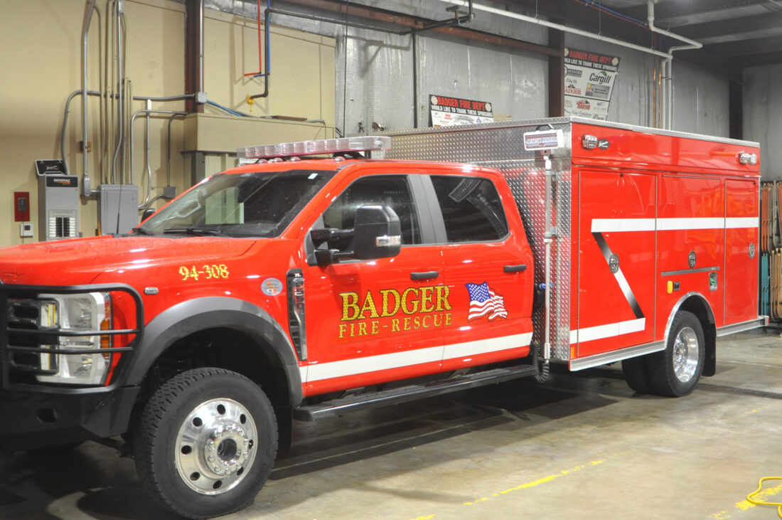Badger’s new fire truck is seen in the firehouse. It is set up to fight grass and field fires, plus it carries medical and rescue gear. It was delivered in September.