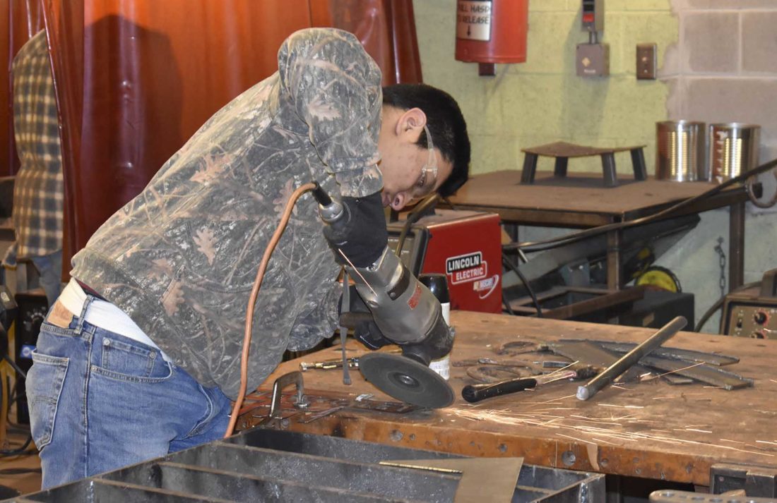Nefi Ramos, 17, a sophomore at Clarion-Goldfield-Dows High School grinds a metal Chevrolet sign at the school recently.