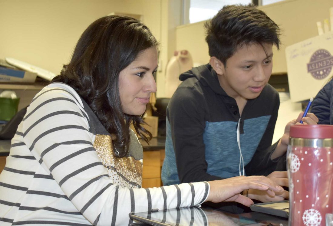 Miriam Meinke, an English Language Learner paraeducator, works with Luis Puac, 15, a sophomore, at Clarion-Goldfield-Dows High School recently.