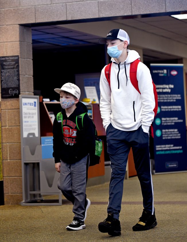 Fort Dodge residents David Petersen, 7, and Joseph Petersen, 12, board their flight to Chicago on Feb. 4 at the Fort Dodge Regional Airport.