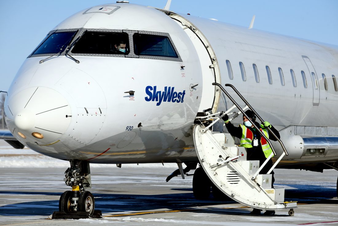 Randy Aponte, ramp agent for Sky West, closes the doors to the plane before take off on Feb. 4 at the Fort Dodge Regional Airport.