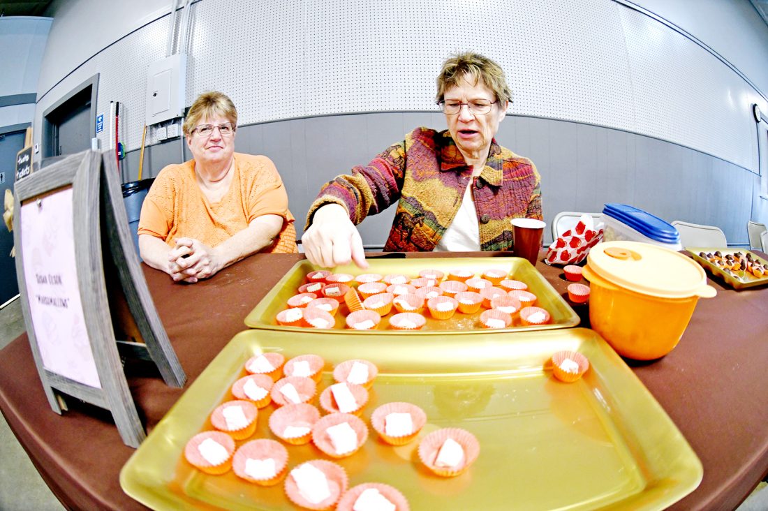 Lorri Miller, left, and Susan Olson, of Fort Dodge, serve marshmallows during the eighth annual “It’s a Chocolate Thing” event at the Webster County Fairgrounds in 2021.