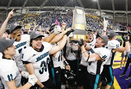 Southeast Valley football players huddle around the Class 2A state championship trophy Nov. 19, 2021, at the UNI-Dome in Cedar Falls. The Jaguars defeated West Lyon, 30-13, to secure their first-ever title.