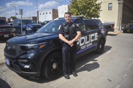 Fort Dodge Police Department Patrol Officer Dylan Samuelson stands near one of the newly redesigned department vehicles.