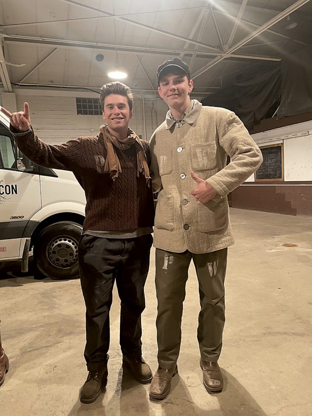 Fort Dodge Senior High sophomore Noah Magruder, right, poses with actor Carter Glade in costume on the set of “Silent Night In Algona”.
