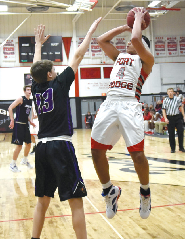 -Messenger photo by Britt Kudla Malcolm Clayton of Fort Dodge shoots over Johnston's Bo Sandquist on Friday
