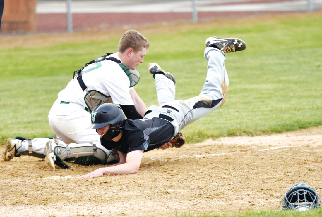-Messenger photo by Britt Kudla Jack McEvoy of St. Edmond tags out Southeast Valley Nolan Johnson on Tuesday at Rogers Park