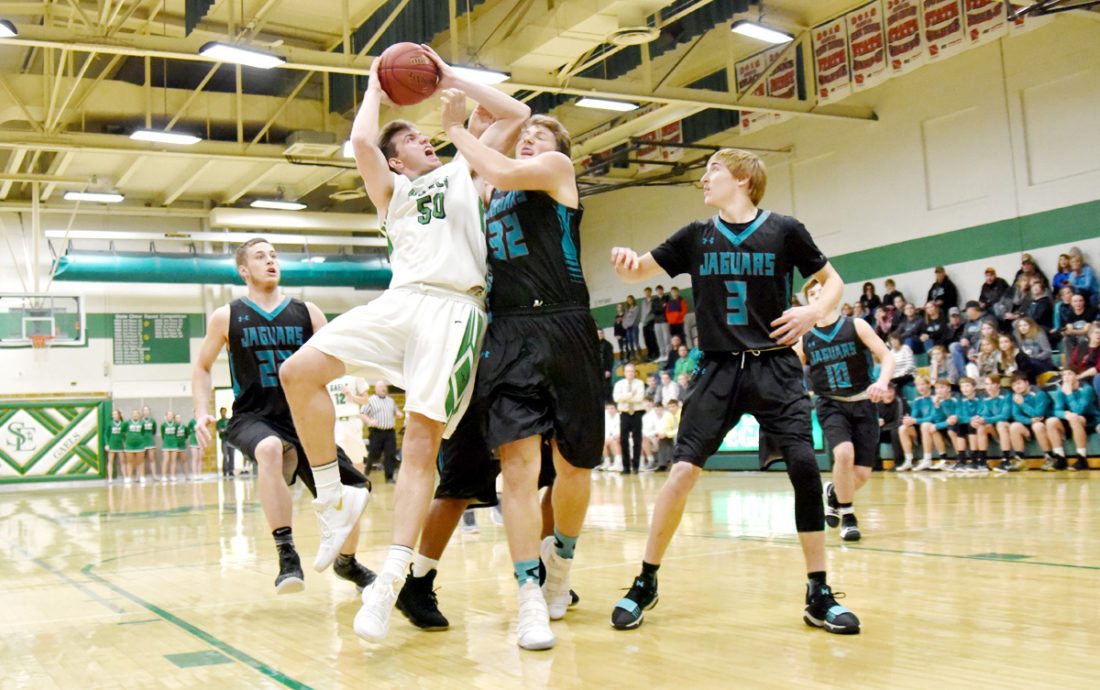 Messenger photo by Britt Kudla Will Woodruff of St. Edmond scores against Southeast Valley earlier this week in the Gael gym.