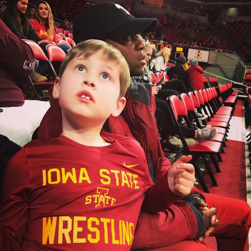 —Submitted Photo todd small, a former iowa central two-time national wrestling champion, sits with Corbin Habeger during an Iowa State wrestling meet. The two were first introduced to one another by Corbin’s mother, Algona High School graduate Bridget Schlievert. Small is a junior on the Cyclone wrestling team.
