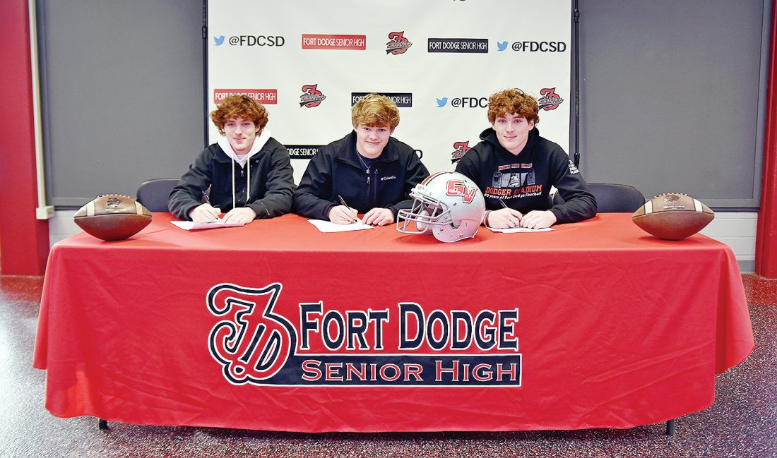 Messenger photo by Britt Kudla Fort Dodge triplets (left to right): Thomas, Sam and James Daniel sign their letters of intent to play football at Grand View University on Wednesday.