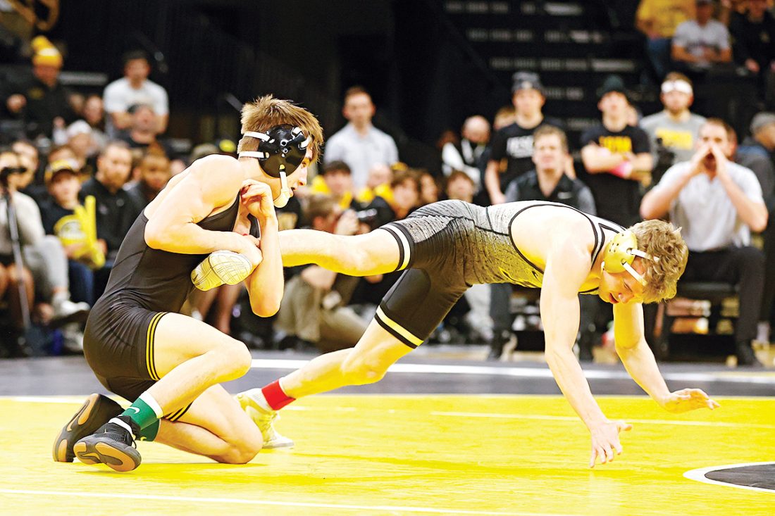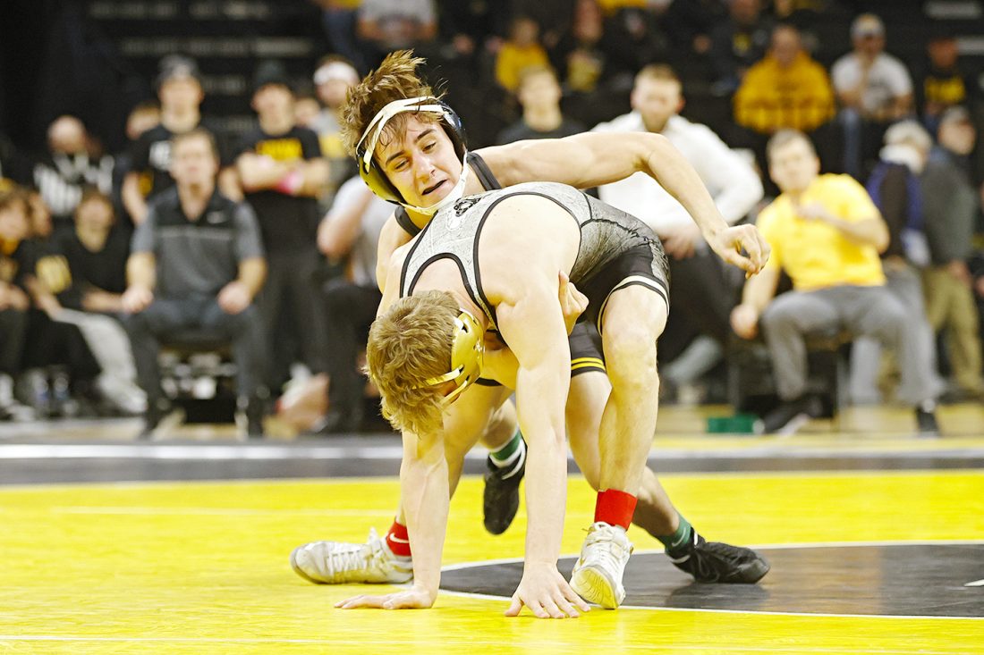 - Iowa’s Drake Ayala wrestles Purdue’s Devin Schroder during the 125-pound bout of their dual at Carver-Hawkeye Arena in Iowa City on Sunday. (Stephen Mally/hawkeyesports.com)