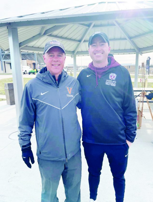 Submitted photo: Former St. Edmond tennis stars Mike Conlon (left) and Aaron Chalstrom pose together before a meet. Conlon is the head coach at West Des Moines Valley; Chalstrom holds the same post at rival Dowling.
