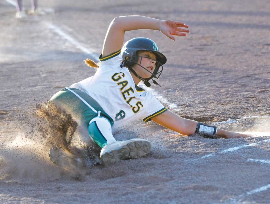 Messenger photo by Britt Kudla: St. Edmond’s Ansley Oswald slides in safely to home plate at Rogers Park on Wednesday night at Rogers Park. For more photos, visit CU at messengernews.net
