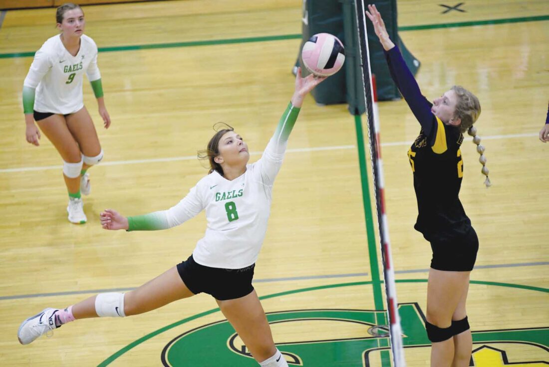 Three early aces from Sasha Hess put the Gaels up 6-1 right out of the gate. A kill from Hadley Oswald made it 12-6 and forced the Eagles to take a timeout, and after the visitors pulled back within 12-9, St. Edmond tallied 13 of the first set’s final 17 points. Kills from Ansley Oswald and Ava Underberg closed the door.