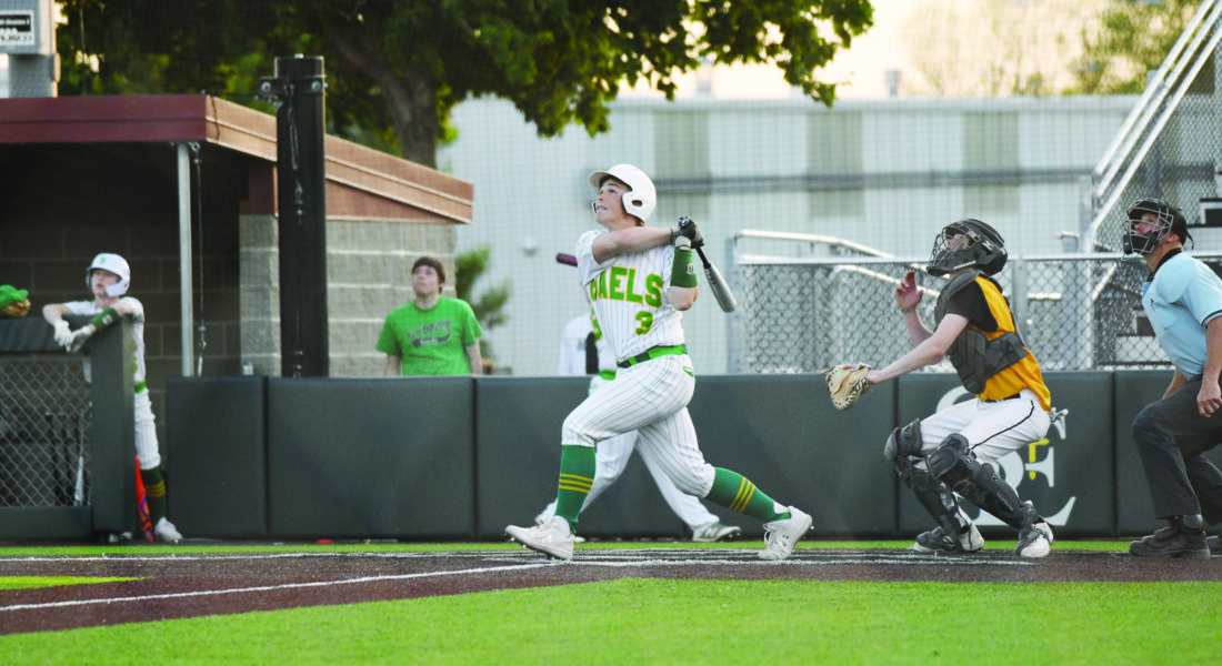 Messenger photo by Britt Kudla: St. Edmond senior John Nemmers had two home runs and drove in seven against Bishop Garrigan on Saturday night, but it wasn’t enough as the Golden Bears rallied and prevailed by a final of 8-7 in a Class 1A district baseball opener.