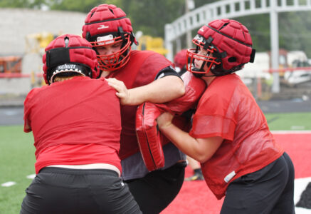 - Messenger photo by Britt Kudla: Fort Dodge linemen Gavin Pederson, Luke Fierke and Joe Constable work through a drill on Tuesday during practice inside Dodger Stadium.