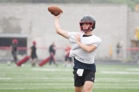 Messenger photo by Britt Kudla: Fort Dodge quarterback Tru McBride throws a pass on Tuesday during practice inside Dodger Stadium.