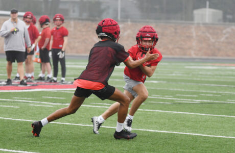 - Messenger photo by Britt KudlaFort Dodge Jamarius Gibbs-Green (right) makes a catch over Jonathan Brown during practice on Tuesday.